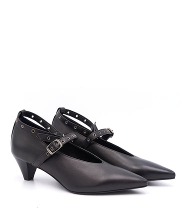 This elegant decolleté combines sleek black leather with a soft leather lining for superior comfort and durability. Featuring a refined pointed toe and a distinctive conical studded strap, it offers a bold yet sophisticated look. Perfectly crafted for those seeking style without compromising on quality, this shoe ensures a secure fit while making a striking statement.