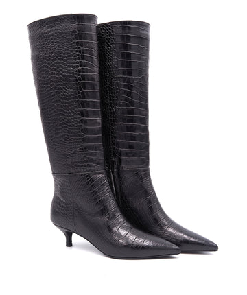 Realizzato in pelle stampata pregiata con fodera interna in pelle, questo stivale nero offre comfort e durata superiori. Il tacco di 5 cm garantisce un'eleganza discreta senza rinunciare alla stabilità, ideale per un look sofisticato e professionale. Una scelta perfetta per chi cerca stile e qualità artigianale in ogni dettaglio.