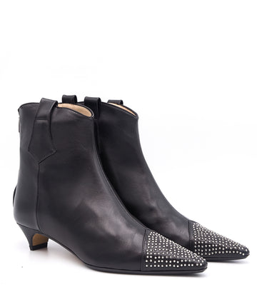 Realizzato in pregiata pelle con una resistente fodera interna, il tronchetto CENTODIECI TRONCH PUNTALE BORCHIE T50 in nero unisce eleganza e carattere. Le borchie applicate sulla punta aggiungono un dettaglio distintivo, garantendo una calzata sofisticata e durevole, ideale per chi cerca stile e qualità in ogni passo.