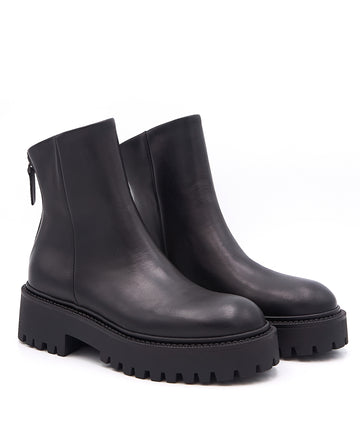 Questo tronchetto in pelle nera con zip posteriore unisce stile e praticità. Il fondo in gomma garantisce comfort e durata, offrendo una calzata stabile e sicura. Pensato per chi cerca un design essenziale senza rinunciare alla qualità dei materiali e alla facilità di utilizzo.