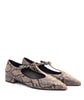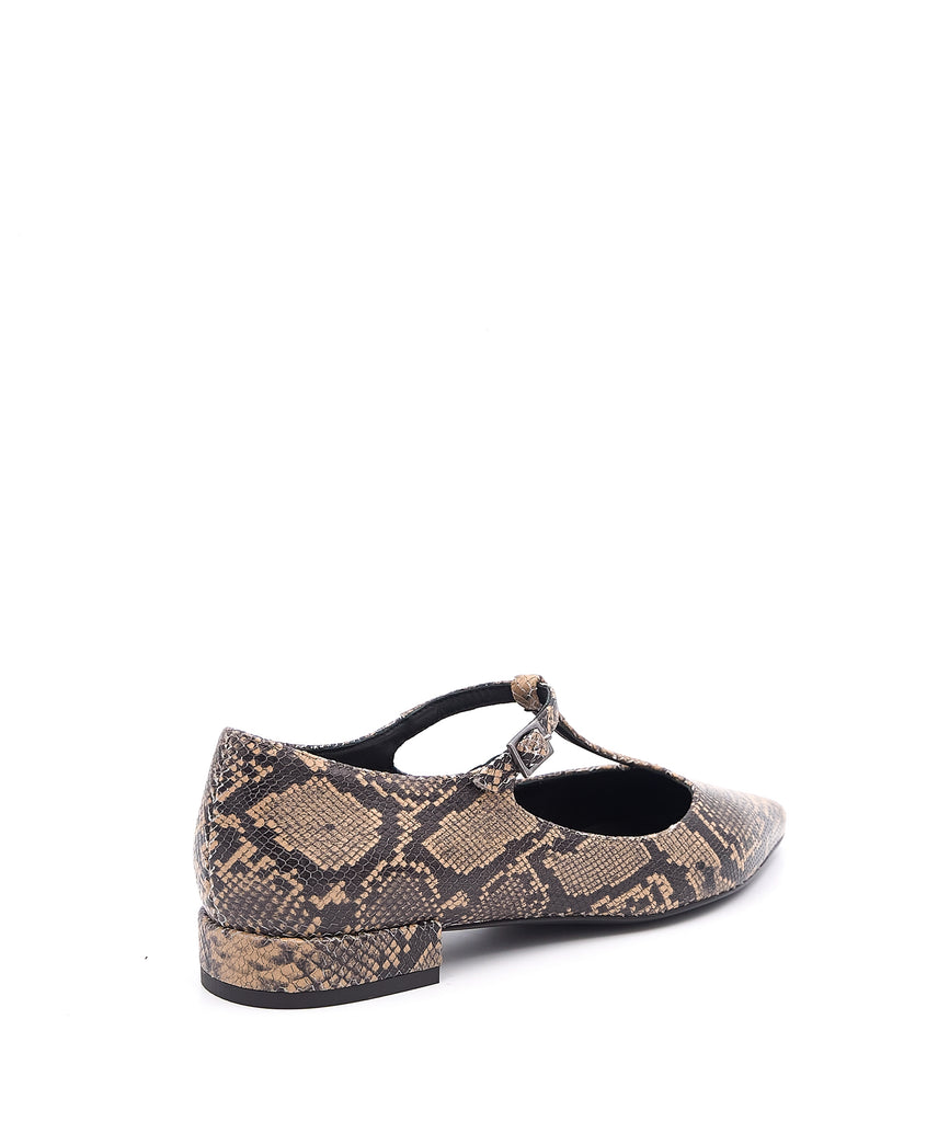 Eleganti ballerine a punta con cinturino a T e tacco basso di 2 cm, realizzate in pelle pitonata. Questo modello unisce stile raffinato e comfort, ideale per chi cerca una calzatura versatile adatta a ogni occasione mantenendo un tocco sofisticato.